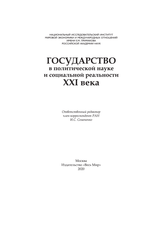 - This book was conceived by the research team of the Primakov National Research Institute of World Economy and International Relations, Russian Academy of Sciences (IMEMO RAS) as a study both in political theory and in comparative politics. The authors discuss the transformations occurring in the state...