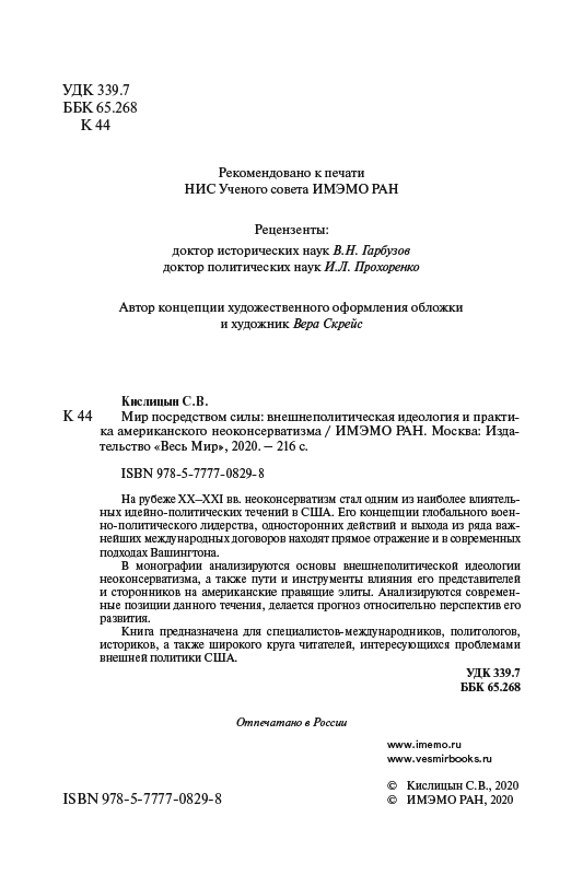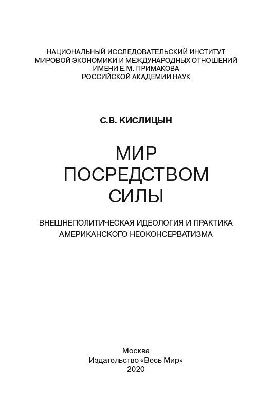 - К выходу в свет книги С. В. Кислицына «Мир посредством силы: внешнеполитическая идеология и практика американского неоконсерватизма».