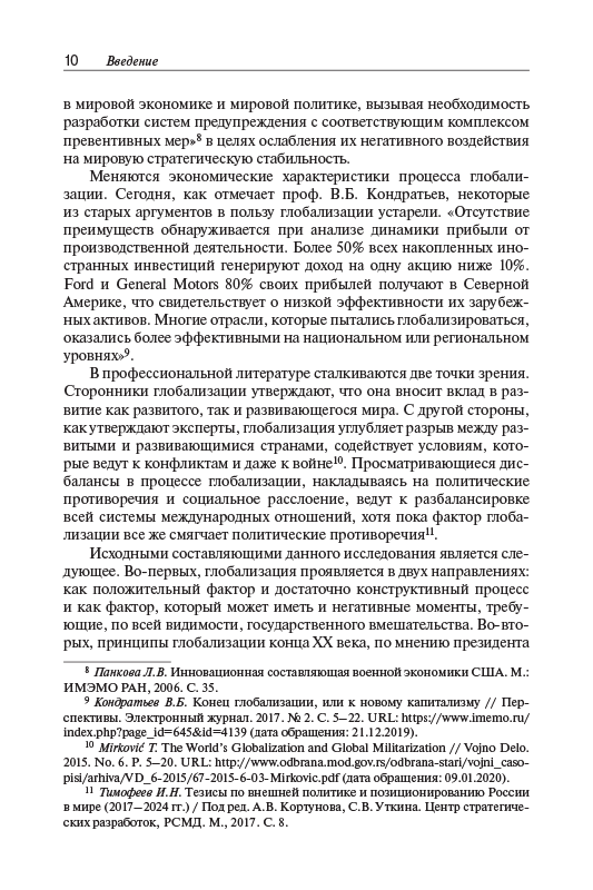 - С начала нового столетия национальная и международная безопасность, частью которых является безопасность военно-экономическая, находятся в состоянии радикальных изменений, особо обострившихся в середине 2010-х годов и, по существу, достигших в настоящий момент точки бифуркации,...