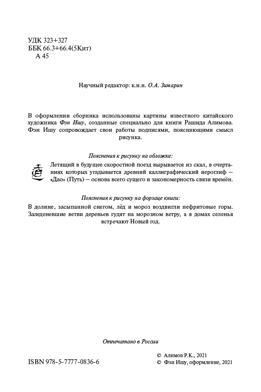Сборник статей государственного и политического деятеля Республики Таджикистан, дипломата, генерального секретаря Шанхайской организации сотрудничества (2016–2018), доктора политических наук, профессора Р.К. Алимова посвящён широкому кругу аспектов внутренней и внешней политики Китая, связанному с развитием международного сотрудничества в рамках китайской инициативы «Пояс и Путь». Статьи основаны на значительном фактическом материале и представляют собой глубокий анализ перспектив взаимодействия стран Евразии с Китаем. Большинство статей были опубликованы в ведущей газете Китая «Жэньминь жибао», а также в научных журналах и СМИ России и Таджикистана.