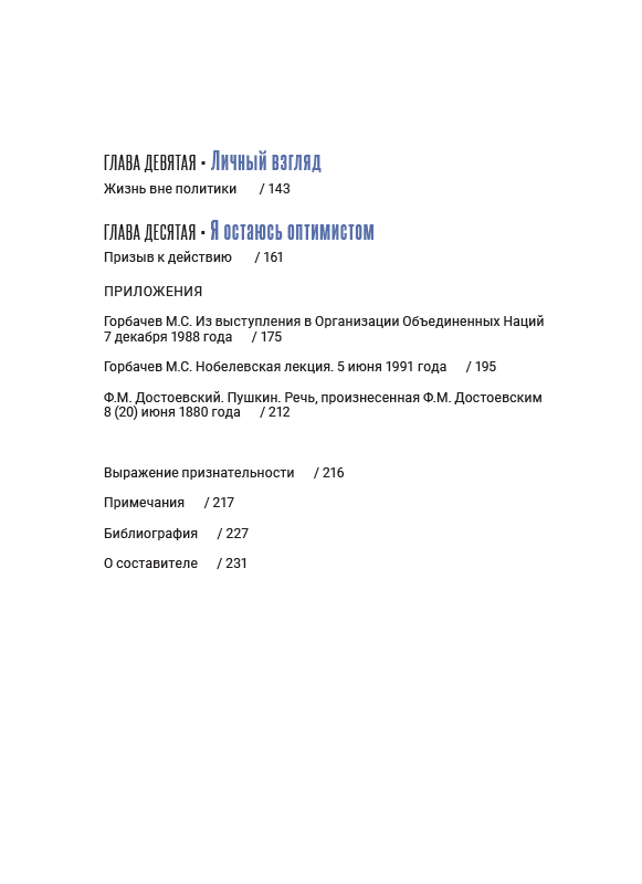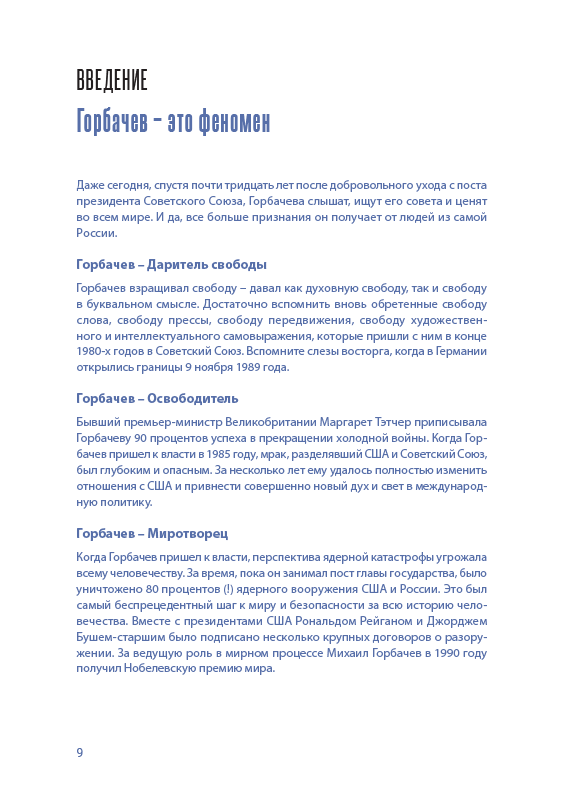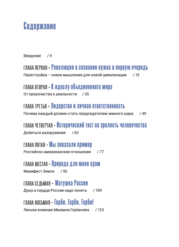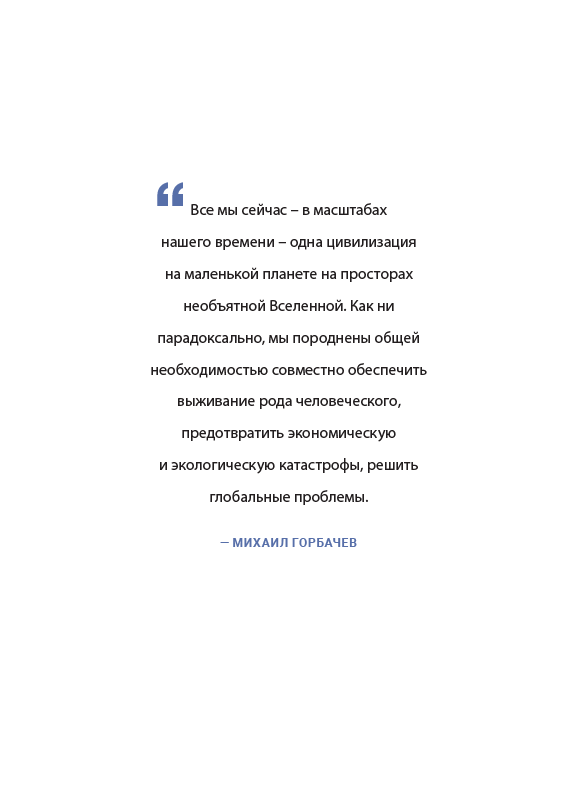 Составитель книги поставил перед собой задачу представить в сгруппированном виде наиболее важные мысли М.С. Горбачева по ключевым вопросам общественного и мирового развития. Каждый раздел книги предваряет вступление составителя, а тексты М.С. Горбачева сопровождаются также высказываниями авторитетных политиков, мыслителей, ученых, авторов, как отечественных так и зарубежных.