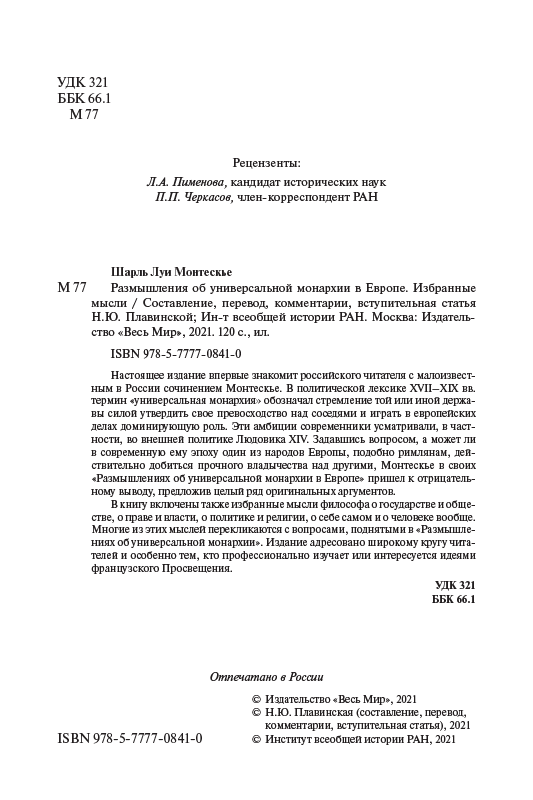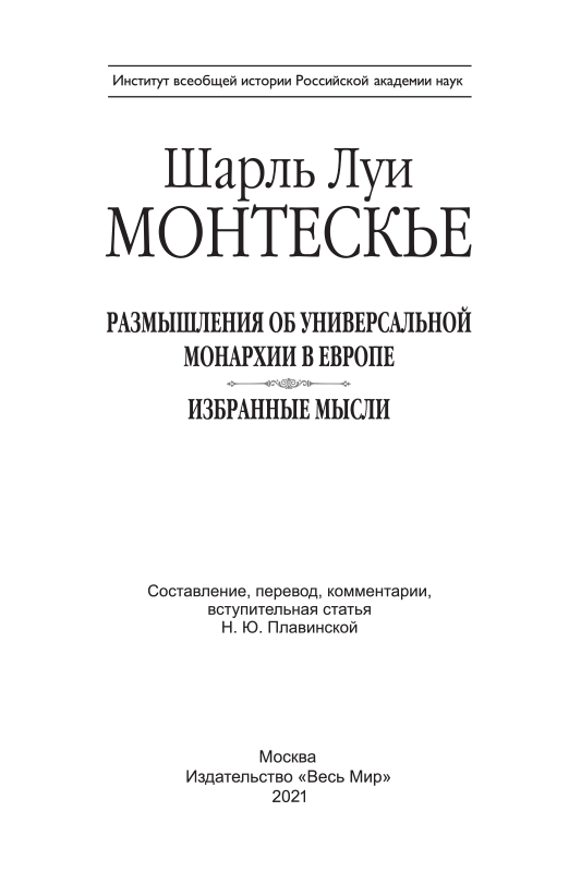 - «Размышления об универсальной монархии в Европе» Шарля Луи Монтескье на русском языке издаются впервые. Удивительно актуально звучат его мысли!