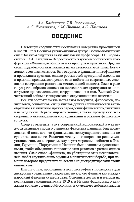 В настоящей книге основанной на материалах, проходившей в мае 2020 г. в Военном учебно-научном центре Военно-воздушных сил «Военно-воздушная академия имени профессора Н.Е. Жуковского и Ю.А. Гагарина» Всероссийской научно-теоретической конференции «Фашизм, неофашизм и их преступная практика» рассматриваются проблемы, связанные с сущностными чертами фашизма как между народного феномена и его проявлениями в различных странах мира. Отдельные статьи посвящены анализу неофашизма и современным проявлениям правого радикализма.