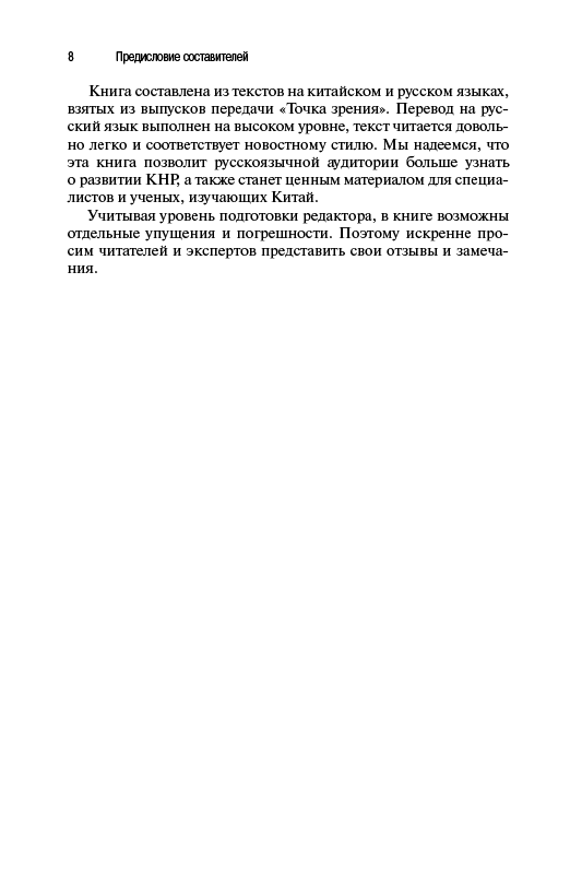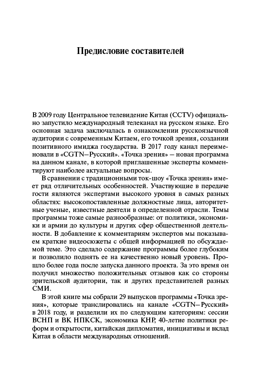 Эта книга составлена из текстов 29 выпусков программы «Точка зрения» китайского телеканала «CGTN–Русский» 2018 года. Статьи разделены тематически: сессии ВСНП и ВК НПКСК, экономика КНР, 40-летие политики реформ и открытости, китайская дипломатия, инициативы и вклад Китая в области международных отношений. Книга позволяет русскоязычной аудитории больше узнать о развитии КНР, а также является ценным материалом для специалистов и ученых, изучающих Китай.