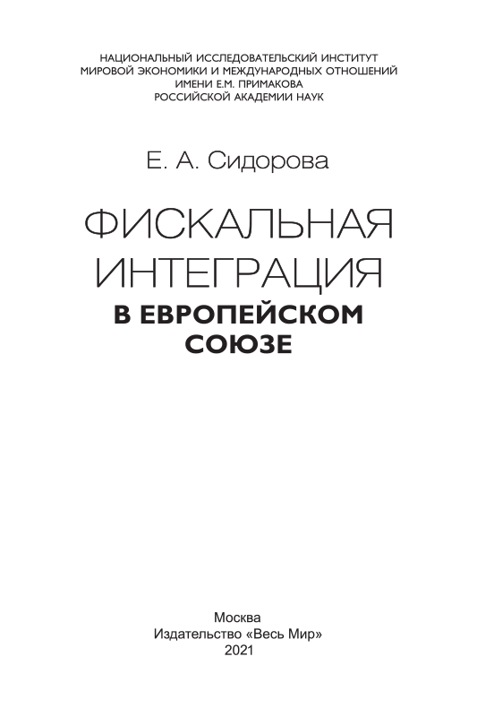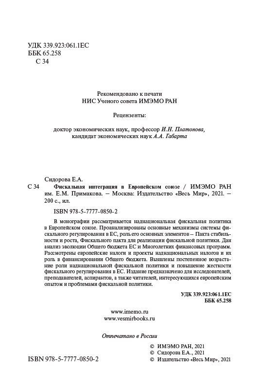- В книге Елены Сидоровой (ИМЭМО) в ретроспективном и актуальном плане рассматриваются вопросы бюджетно-налоговой политики стран ЕС, составляющие одну из важнейших системообразующих опор Союза. Особо следует отметить большое значение, которое имеет опыт европейской интеграции для интеграционных процессов в Евразии.