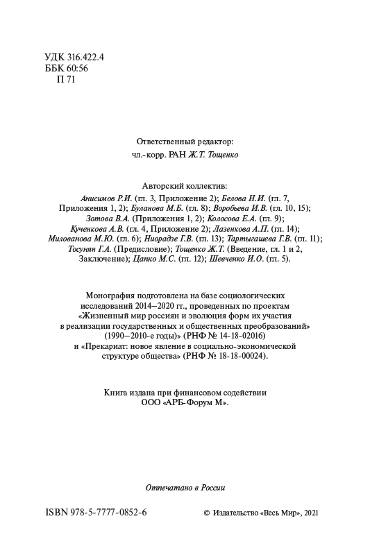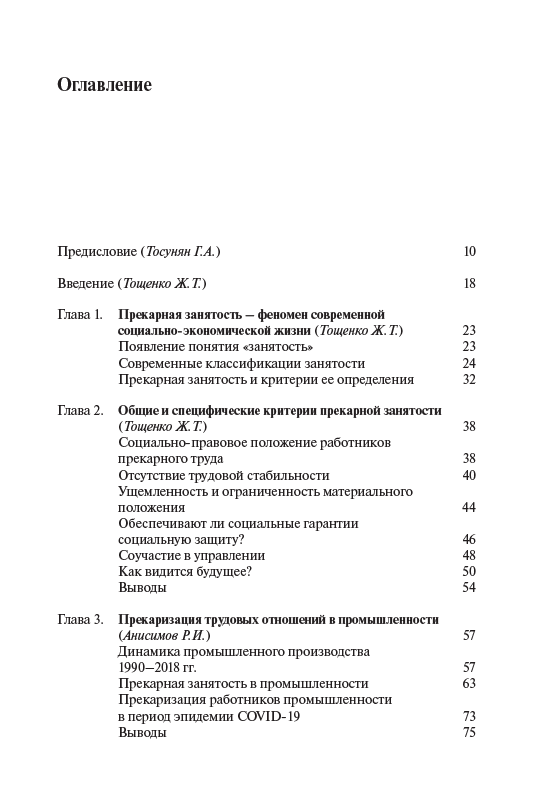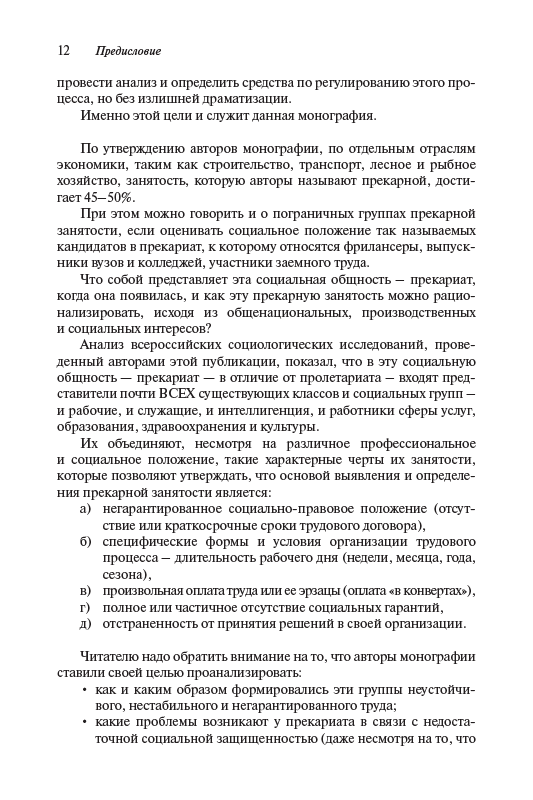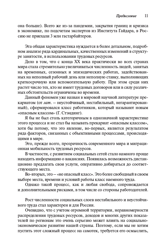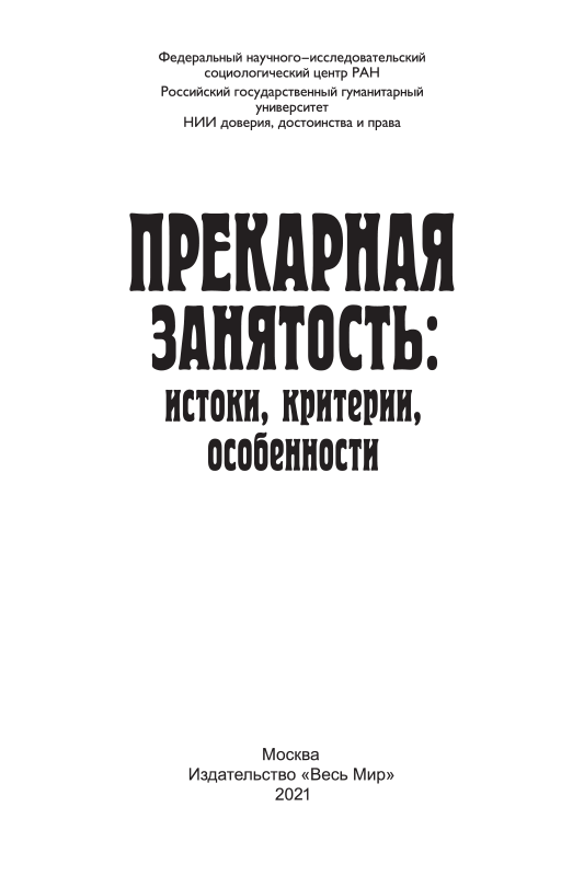 В монографии анализируется прекарная форма занятости, наиболее точно отражающая сущность социально-экономического положения людей по сравнению с ранее употреблявшимися понятиями, характеризовавшими занятость такого рода, – нестандартная, неформальная и т.п. Авторы показывают, что в условиях Четвертой промышленной революции и Шестого технологического уклада прекарная занятость становится характерной для противоречивого состояния рабочей силы, всевозрастающей зависимости работников производства от диктата работодателей. Исследование опирается на статистические и социологические данные, полученные в результате масштабных опросов 2014–2015 гг. и особенно 2018–2020 гг., показавшие, что прекарная занятость становится характерной чертой всех без исключения сфер общества, а не только производства, при этом прекарное состояние работников распространяется на весь уклад и образ жизни.