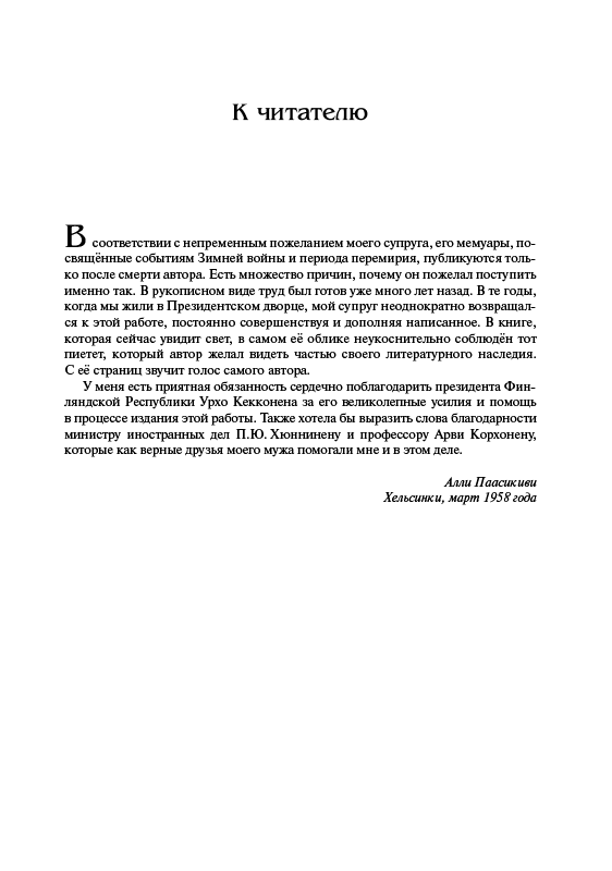 - В соответствии с непременным пожеланием моего супруга, его мемуары, посвящённые событиям Зимней войны и периода перемирия, публикуются только после смерти автора. Есть множество причин, почему он пожелал поступить именно так. В рукописном виде труд был готов уже много лет назад....