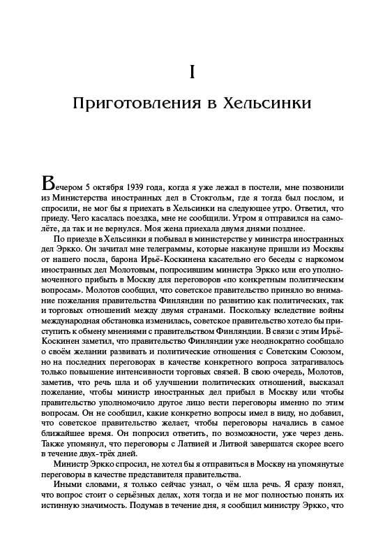 В книге впервые на русском языке публикуются воспоминания выдающегося политического деятеля Финляндии Юхо Кусти Паасикиви (1870–1956) о событиях 1939–1941 гг. Первую часть книги составили записки о его участии в переговорах в Москве осенью 1939 г., предшествовавших началу Советско-финляндской войны (Зимней войны), а также в переговорах по заключению мира в марте 1940 г. В обоих случаях Паасикиви (как это было и при заключении Тартуского мира в 1920 г.) возглавлял финскую делегацию. Во вторую книгу вошли воспоминания о работе послом Финляндии в Советском Союзе после заключения мира с марта 1940 и до конца мая 1941 г. Паасикиви придавал большое значение этим воспоминаниям и работал над ними будучи президентом страны (1946–1956), но завещал опубликовать их лишь после смерти, что и было выполнено его вдовой. Воспоминания Паасикиви, награжденного в 1954 г. орденом Ленина за вклад в развитие советско-финских отношений, представляют собой исключительно важный исторический источник по истории начального периода Второй мировой войны и советско-финских отношений.
