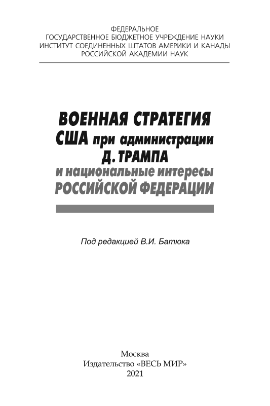 - В Институте США и Канады РАН подготовлена книга «Военная стратегия США при администрации Д. Трампа» под редакцией д.и.н. В. И. Батюка.