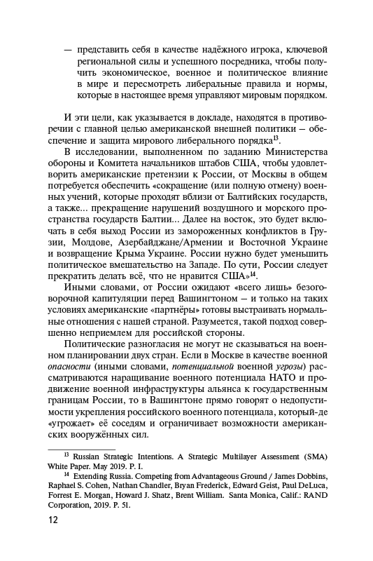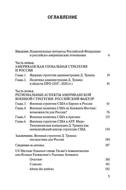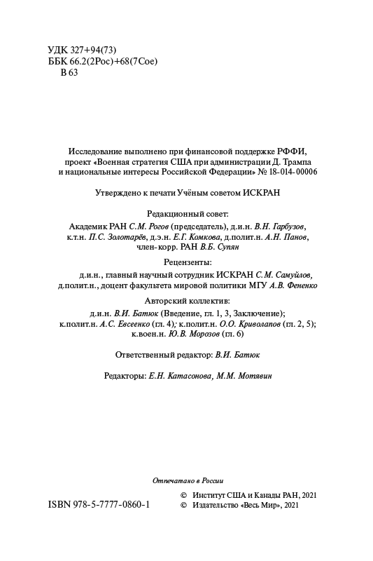 В книге проанализированы как функциональные, так и региональные аспекты военной стратегии США при администрации Д. Трампа, а также возможные последствия действий американской стороны для национальной и военной безопасности Российской Федерации. Перемены в американской стратегии сказываются, во-первых, на стратегическом балансе между Москвой и Вашингтоном – и это касается как стратегических оборонительных, так и стратегических наступательных вооружений. Во-вторых, трансформация военной стратегии Соединённых Штатов влияет на состояние военного баланса в тех регионах планеты, которые непосредственно примыкают к «периферии» Российской Федерации, – в Европе, на Ближнем и Среднем Востоке, в АТР и в Арктике.