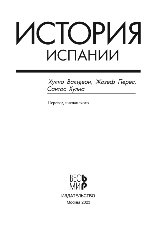 «История Испании» написана тремя замечательными авторами: Хулио Вальдеоном, Жозефом Пересом и Сантосом Хулиа, создавшими яркий и запоминающийся профессиональный очерк испанской истории. Книга переведена на русский язык впервые и вышла в знаменитой серии «Национальная история». Книга издана при поддержке Межгосударственной Корпорации Развития (МКР).