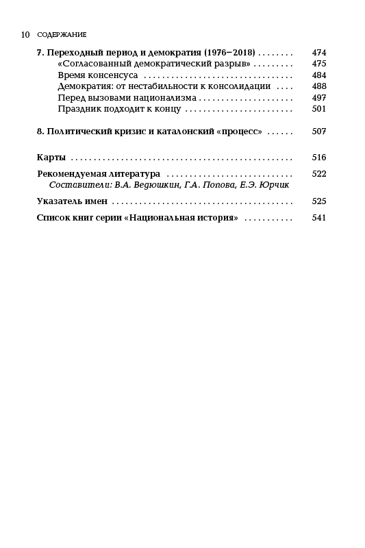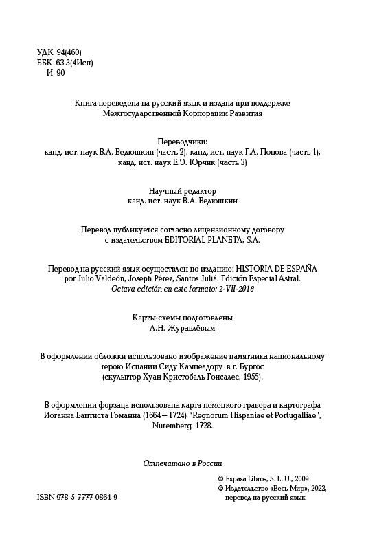 Общий очерк отечественной истории, написанный тремя выдающимися испанскими историками и выдержавший несколько переизданий, в Испании по праву считается классическим. В нем изложены основные события истории страны с древности до первых десятилетий XXI в. В частности, исследована эпоха господства мусульман на Пиренейском полуострове и борьба христианских государств за освобождение страны. Рассмотрены особенности социально-экономического и политического развития Испанской монархии, эволюция колониальной империи, взаимоотношения Церкви и государства, социокультурная специфика исторических областей. Проанализированы бурные события XIX – начала XXI в., включая Войну за независимость в начале XIX в., Гражданскую войну (1936–1939), франкистский режим, переход от диктатуры к демократии, особенности развития общенациональной и региональной национальной идентичности.