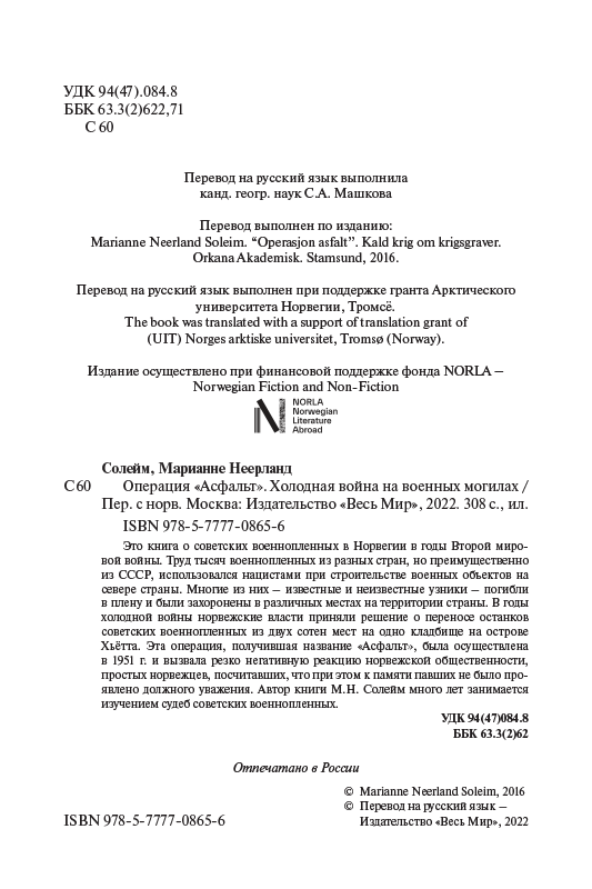 - Норвежское литературное агентство НОРЛА, призванное поддерживать переводы с норвежского языка на иностранный, уведомило издательство «Весь Мир» о получении им экземпляров, изданной нами книги норвежского исследователя Марианне Солейм «Операция „Асфальт“. Холодная война на солдатских могилах». Одновременно агентство сообщило, что не может выполнить свои финансовые обязательства перед нами.