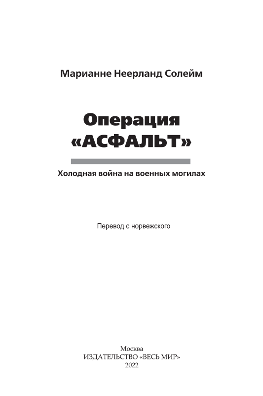 - Вышла в свет книга Марианне Неерланд Солейм: Операция «Асфальт». Холодная война на военных могилах. Это вторая книга Солейм о советских военнопленных в Норвегии. Первая вышла на русском языке 10 лет назад.