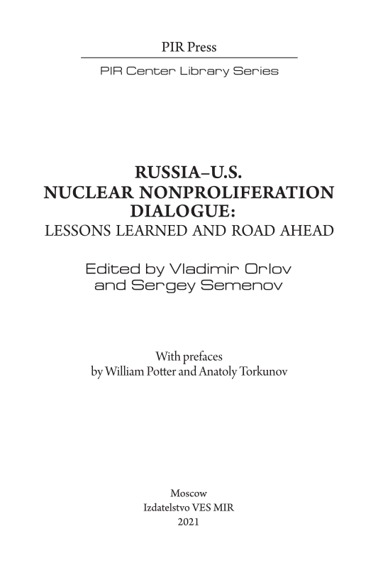 Russia-U.S. Nuclear Nonproliferation Dialogue. Ed. by Vladimir Orlov and Sergey Semenov.