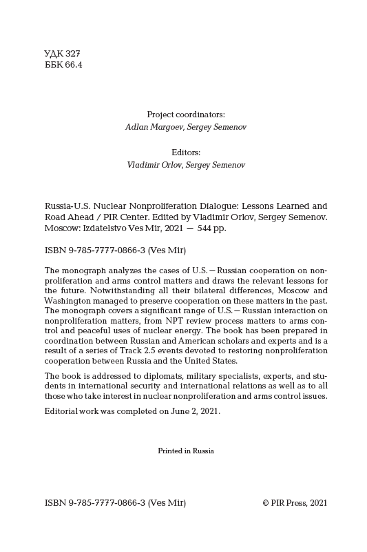 The monograph analyzes the cases of U.S.–Russian cooperation on nonproliferation and arms control matters and draws the relevant lessons for the future. Notwithstanding all their bilateral differences, Moscow and Washington managed to preserve cooperation on these matters in the past. The monograph covers a significant range of U.S.–Russian interaction on nonproliferation matters, from NPT review process matters to arms control and peaceful uses of nuclear energy. The book has been prepared in coordination between Russian and American scholars and experts and is a result of a series of Track 2.5 events devoted to restoring nonproliferation cooperation between Russia and the United States.