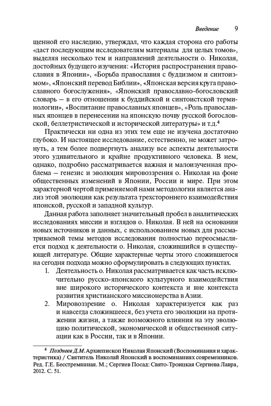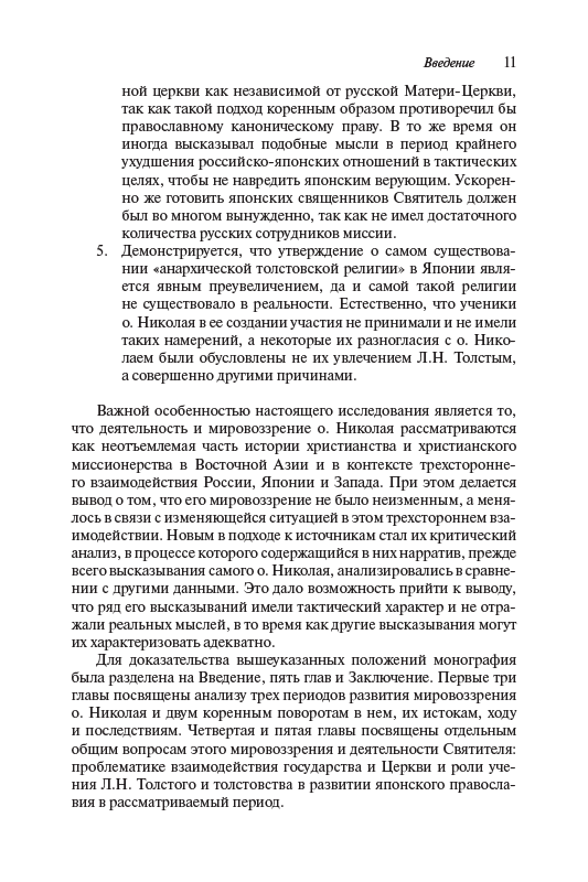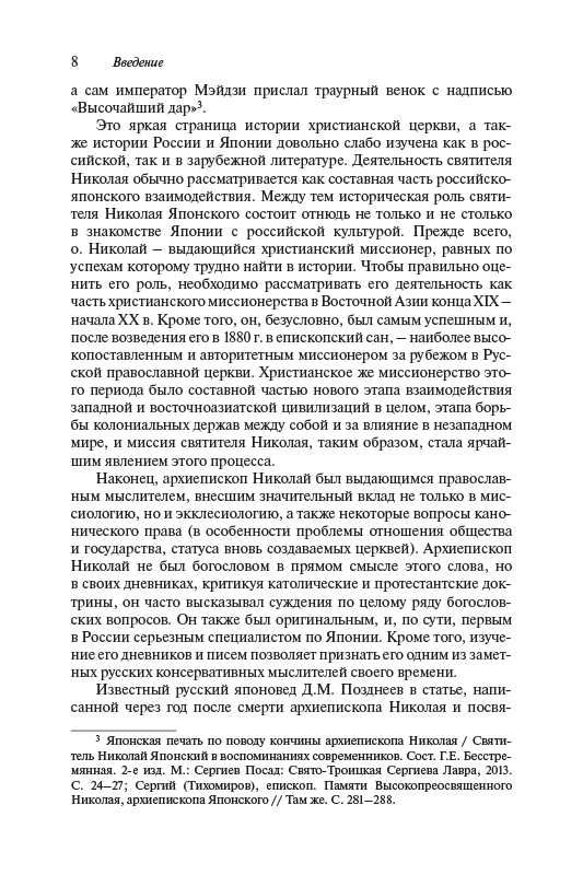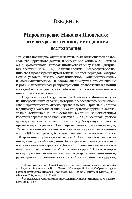 Книга посвящена жизни и деятельности выдающегося православного церковного деятеля и миссионера конца XIX – начала XX в. архиепископа Николая Японского (в миру Иван Дмитриевич Касаткин, 1836–1912). В ней исследуется эволюция его мировоззрения путем выделения трех периодов, которые можно условно назвать «западническим», «оптимистическим» и «пессимистическим». В работе подробно анализируется его отношение к роли и перспективам распространения православия в Японии в каждый из этих периодов, а также объясняется, чем вызваны изменения в его мировоззрении. Отдельно рассматриваются подходы архиепископа Николая к отношениям между государством и Церковью и к статусу Японской православной церкви, а также роль, которую в развитии его мировоззрении сыграло распространение в Японии учения Л.Н. Толстого. Особенностью работы является рассмотрение взглядов Николая Японского на фоне широкой картины развития России и Японии в конце XIX – начале XX в. и их культурно-цивилизационного взаимодействия с Западом. Книга представляет интерес для специалистов по истории миссионерства и Церкви, культурным связям Японии и России, а также для всех, кто интересуется мировой историей рассматриваемого периода.