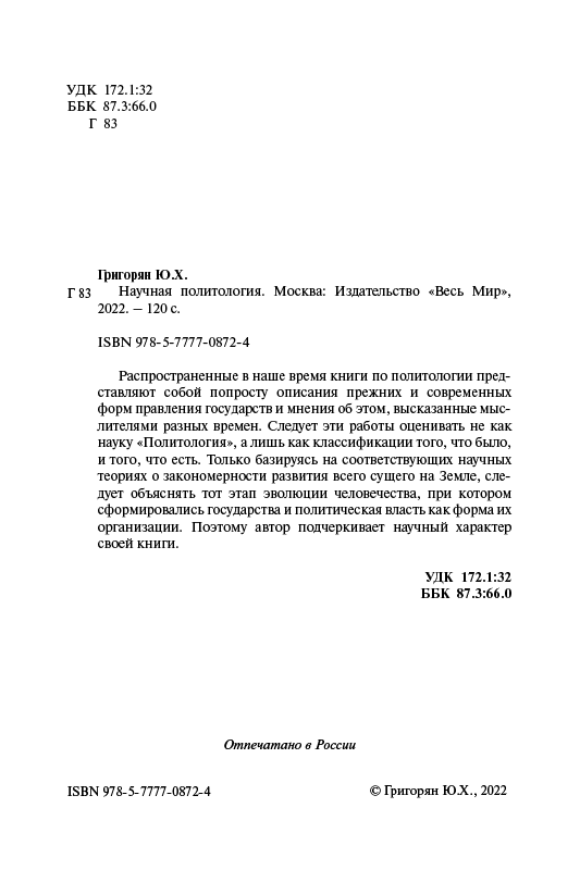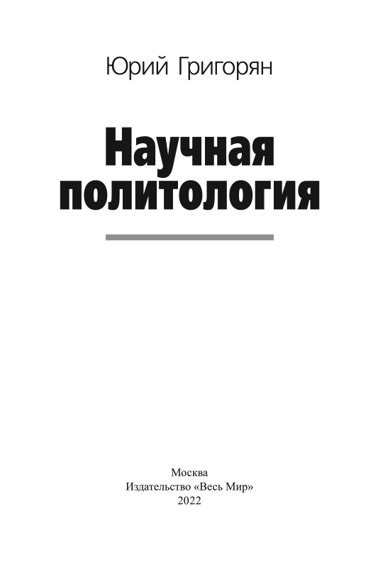 - «Научная политология», так назвал свою работу философ. Это уже четвертая книга Григоряна, выходящая в свет в издательстве «Весь Мир». И все эти книги окрашены яркой индивидуальностью автора, предлагающего свой подход к решению ключевых проблем науки и философии. Автор последовательно использует научный подход к рассмотрению самых сложных вопросов.