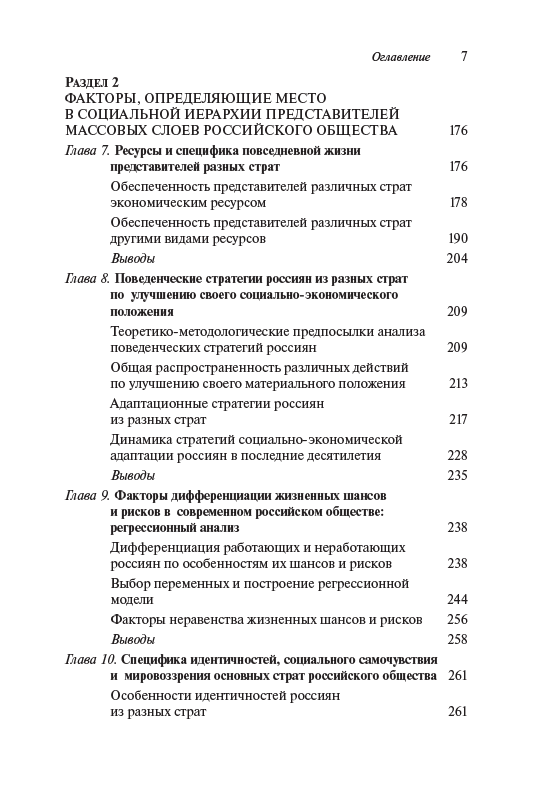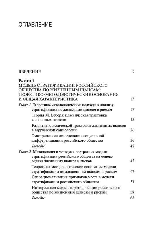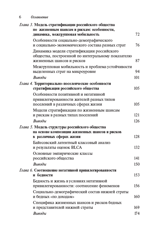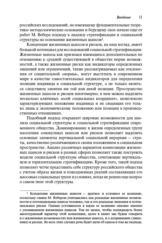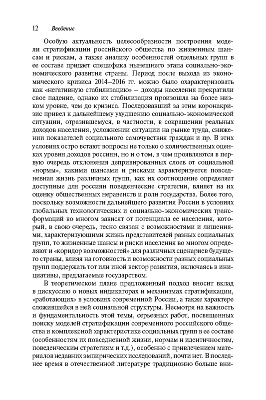 Книга посвящена анализу социальной структуры российского общества. Авторы обращаются к относительно новому для российских исследований, но имеющему фундаментальные теоретико-методологические основания и популярному за рубежом подходу к анализу стратификации на основании соотношения жизненных шансов и рисков. Предложена методология построения вертикальной модели стратификации российского общества на основании учета места человека в четырех ключевых сферах жизни – экономического положения, ситуации на работе, возможностей сохранения и наращивания своего человеческого потенциала, а также особенностей потребления и досуга. В центре внимания авторов при анализе массивов эмпирических данных двух «линеек» мониторинговых исследований (РМЭЗ НИУ ВШЭ и Мониторинга ИС ФНИСЦ РАН) специфика и динамика этой модели, особенности повседневного бытия отдельных групп в ее составе, факторы, определяющие дифференциацию их жизненных шансов и рисков, а также межгрупповая мобильность.