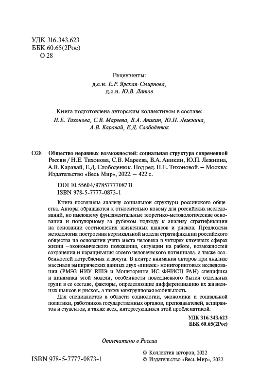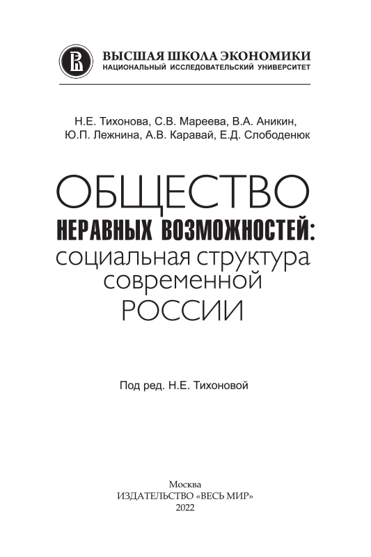 Книга, написанная коллективом социологов НИУ ВШЭ во главе с Н. Е. Тихоновой, дает ключ к пониманию общества, в котором мы с Вами живем. И это общество — несправедливо, потому что оно не дает равных шансов всем. Основанная на большом массиве данных, это концептуально целостная книга своим содержанием обращена к широкому кругу специалистов-обществоведов и экспертов. Но и те кто относится к числу профессиональных социологов, специалистов в области политической науки прочтут книгу с большим интересом и пользой.