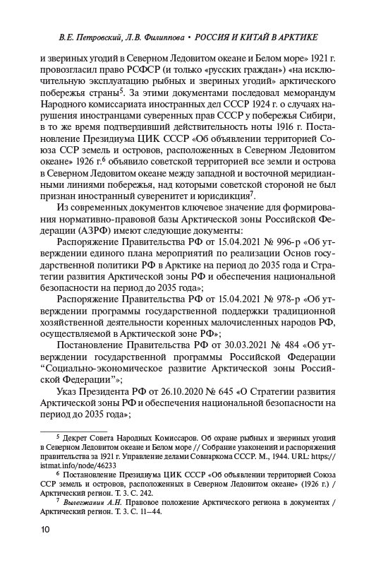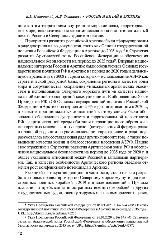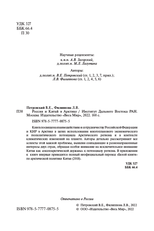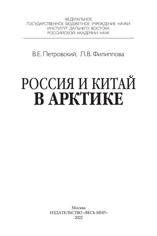 - Новая книга исследователей из Института Дальнего Востока РАН Владимира Петровского и Людмилы Филипповой посвящена взаимодействию России и Китая в этом регионе. В приложении к книге приведен перевод на русский язык важнейшего стратегического документа «Белой книги» по Арктике, опубликованной в Китае в 2018 году. Авторы рисуют актуальную и непростую картину ситуации в этом важнейшем регионе мира.