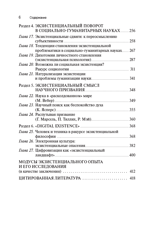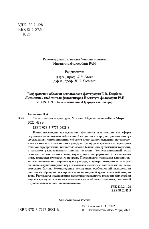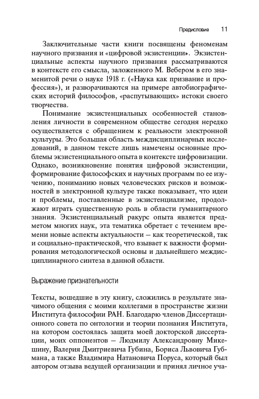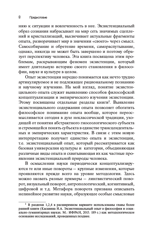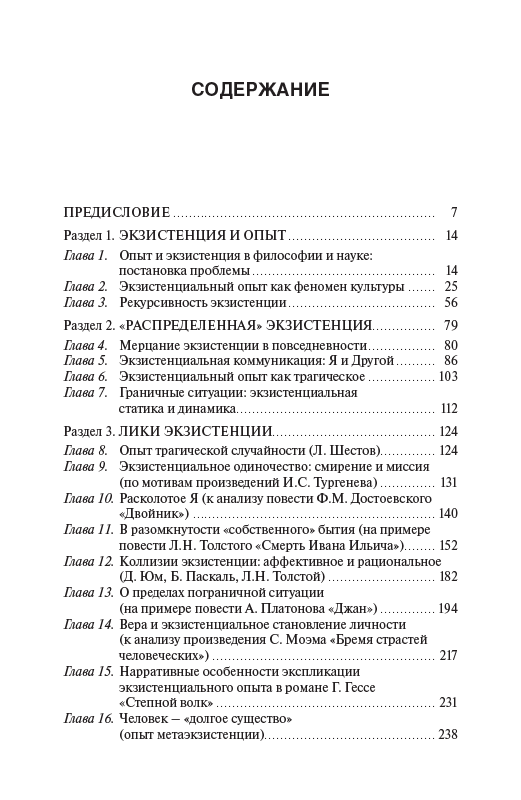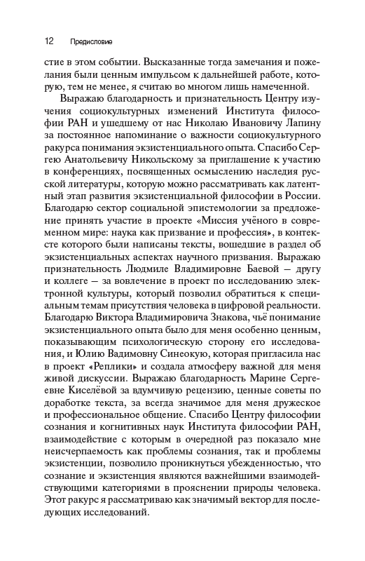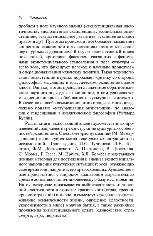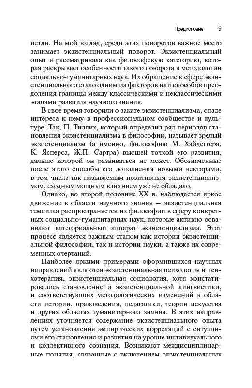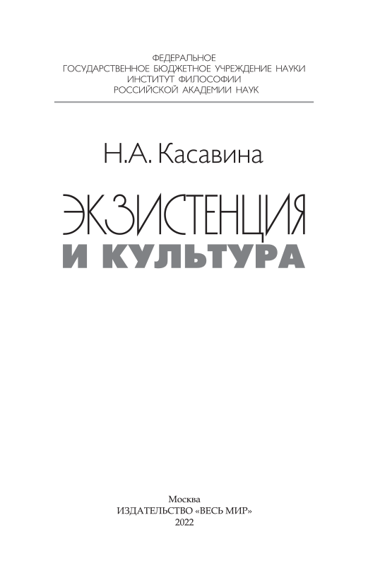 Книга посвящена исследованию феномена экзистенции как сферы переживания человеком собственной ситуации в мире, пограничности существования, самопонимания субъекта и его самоопределения по отношению к смыслам и ценностям культуры. Культура предстает как пространство конструирования личностью своего бытия, его субъектный горизонт, в котором разворачивается личная история. Экзистенциальный опыт понимается как основа концептуализации непрерывности жизненного пути, имеющая рекурсивную природу. Предлагается трактовка влияния экзистенциализма на современную культуру, в центре которого – поворот социально- гуманитарных наук к смысложизненным составляющим человеческого бытия. Реконструкция культурных особенностей экзистенции дополнена обращением к произведениям мировой художественной литературы. Результаты исследования позволяют расширить горизонт философии науки и культуры, включив в него значительный пласт тематики, связанной с проблемой экзистенциального опыта.