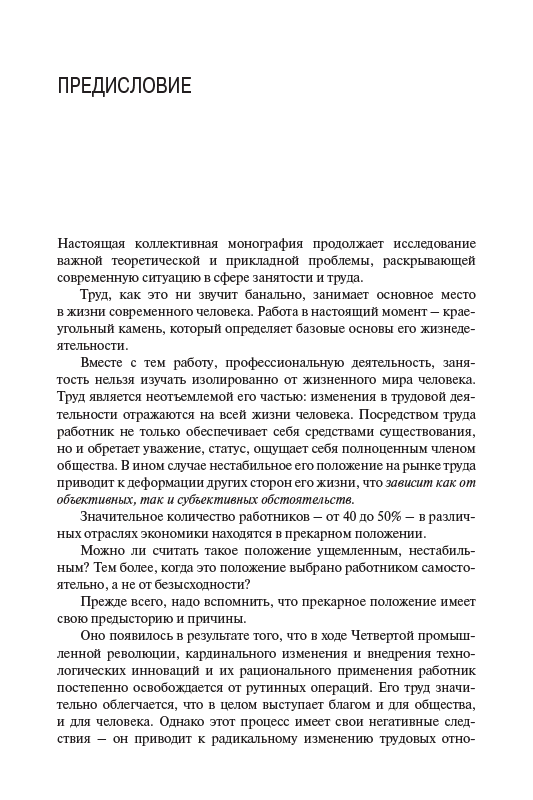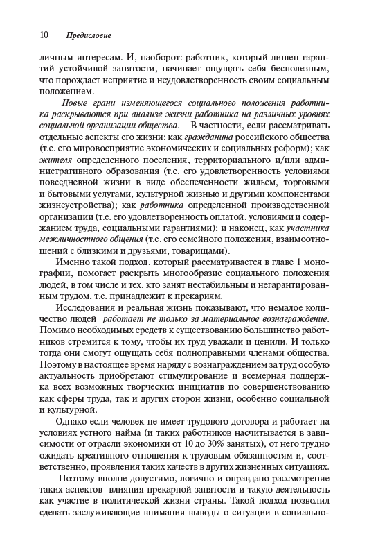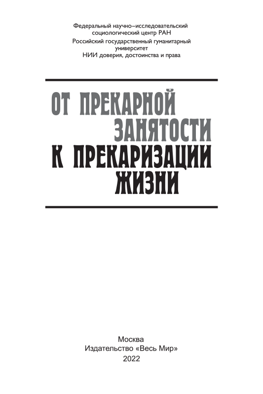- Цель настоящей монографии — решение двух взаимосвязанных задач: а) обоснование тезиса о том, что прекаризация труда имеет ярко выраженную тенденцию проецировать неустойчивость, нестабильность и негарантированность труда на другие стороны жизни человека и прежде всего на социальную...