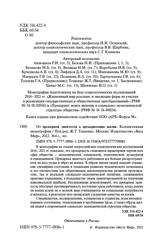 Жан Тощенко (ред.) «От прекарной занятости к прекаризации жизни». М.: Изд-во «Весь Мир», 2022