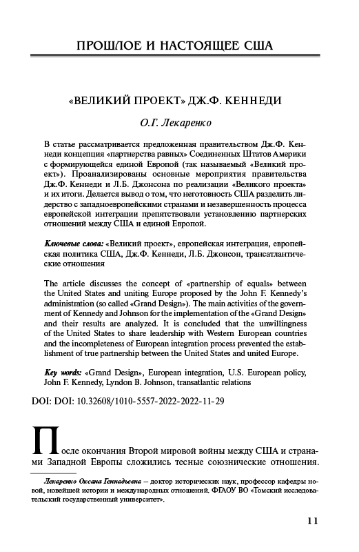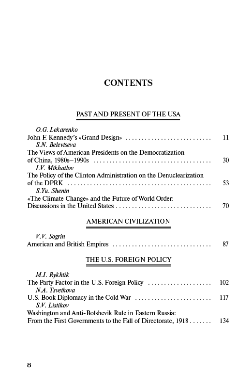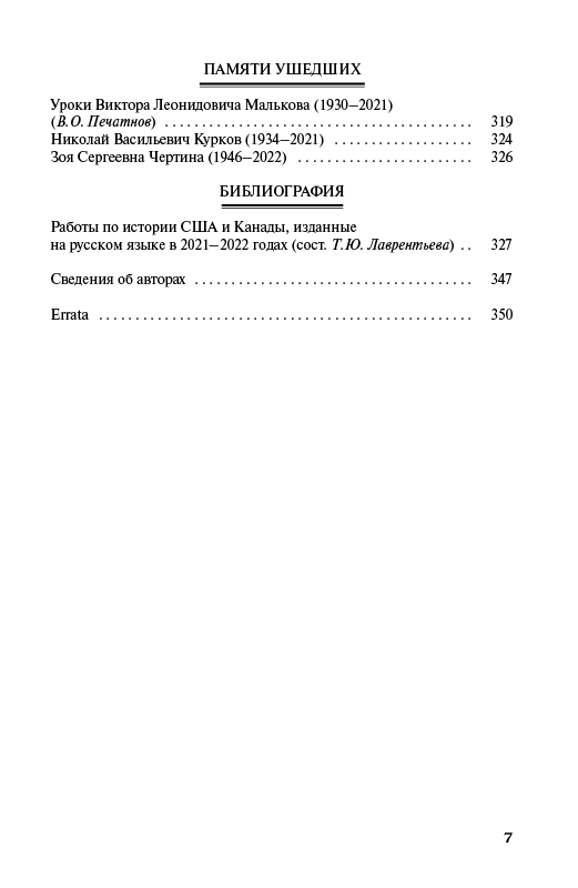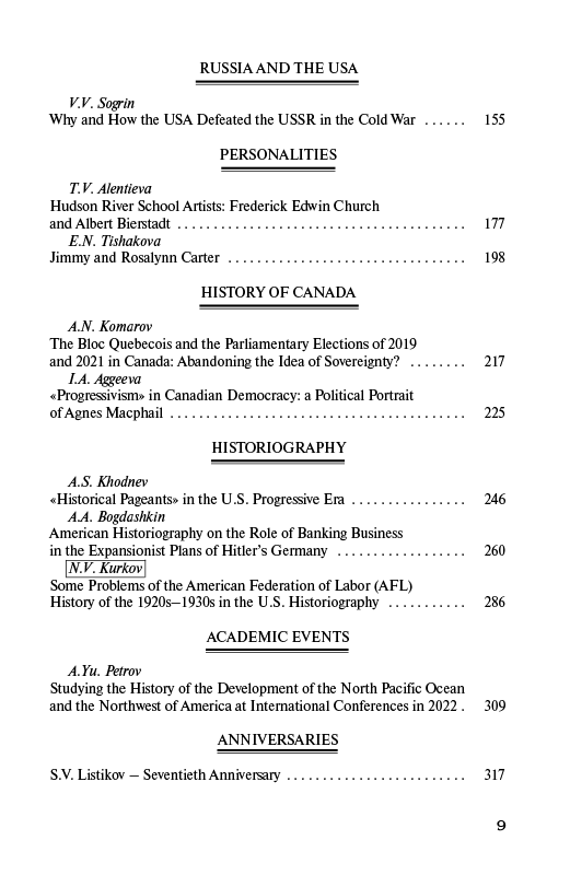 В рубриках «Прошлое и настоящее США», «Внешняя политика США» рассмотрены такие внутри и внешнеполитические проблемы, как «Великий проект» Дж.Ф. Кеннеди, политика Б. Клинтона относительно денуклеаризации КНДР, дискуссии в США о роли КНР в «изменении климата» и будущего миропорядка, роль партийного фактора во внешней политике США, американская «книжная дипломатия» в годы холодной войны. В рубриках «Американская цивилизация» и «Россия и США» публикуются статьи об Американской и Британской империях и причинах победы США над СССР в холодной войне. В рубрике «Персоналии» детально изложены биографии крупнейших художников «Школы реки Гудзон», а также биографии президента Джимми Картера и его супруги Розалин. Различная проблематика американской историографии исследована в статьях в рубрике «Историография». В рубрике «История Канады» опубликована статья об отношении Канадского блока к идее суверенитета на парламентских выборах 2019 и 2021 гг., нарисован яркий политический портрет первой женщины – депутата федерального парламента Канады Агнес Макфейл. В традиционной рубрике «Библиография» дан список публикаций на русском языке по истории США и Канады, вышедших в свет в 2021–2022 гг.