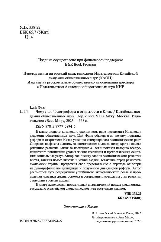 В книге видного китайского экономиста, вице-президента Китайской академии общественных наук Цай Фана объясняется, почему политика реформ и открытости Китая успешно стимулировала экономический рост. Опираясь на факты и логику экономического анализа, автор кратко описал успешное развитие Китая за последние 40 лет и показал историю беспрецедентного повышения уровня жизни населения и предоставления основных социальных услуг. Автор дал оценку этапов экономического развития Китая, выявил новые вызовы и новые задачи, встающие перед развитием экономики страны, предложил свое представление о переходе от опоры на демографические дивиденды к получению дивидендов реформ. Автор рассмотрел путь поддержания устойчивого экономического роста и преодоления ловушки среднего дохода и совершения перехода на этап развития с высоким уровнем дохода.