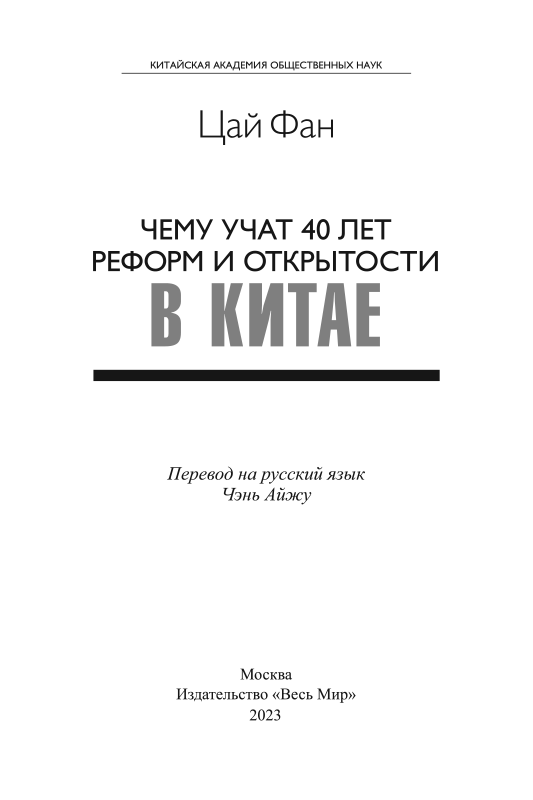 - Вышла в свет на русском языке вторая книга выдающегося китайского экономиста, вице-президента Китайской академии общественных наук Цай Фана «Чему учат 40 лет реформ и открытости в Китае».