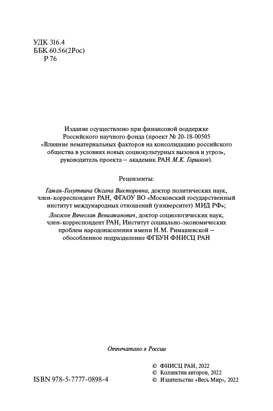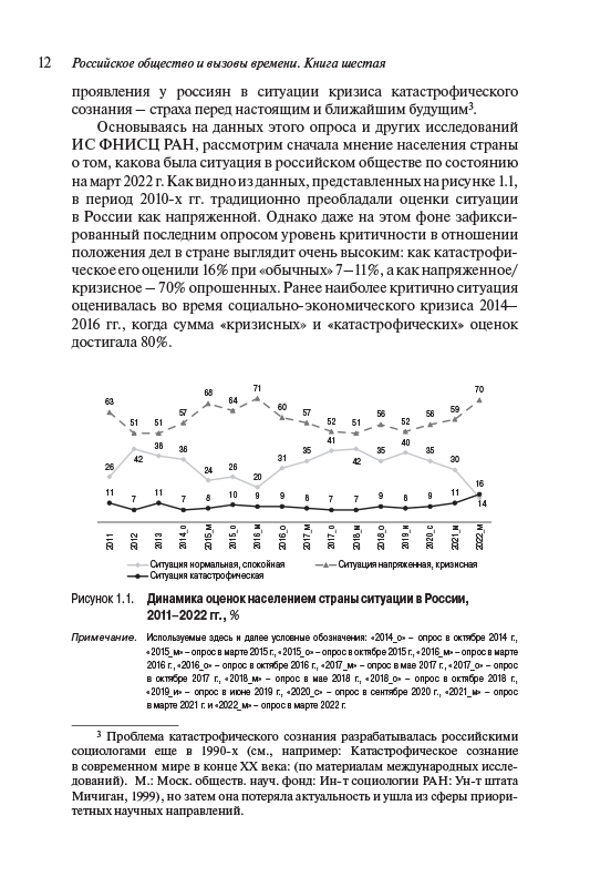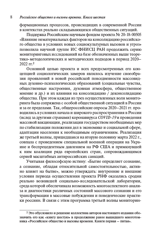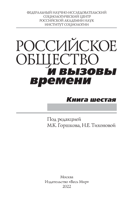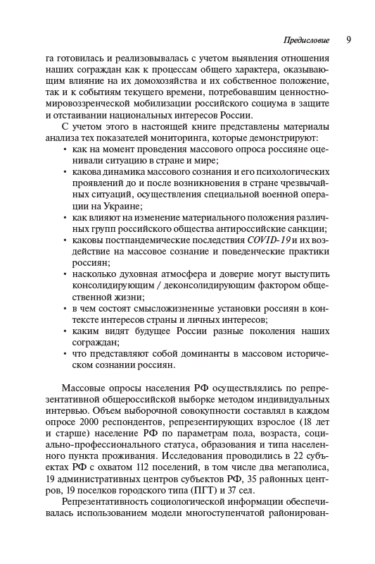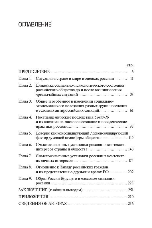 В издании на основе результатов социологического мониторинга дается анализ состояния и динамики российского социума в 2020–2022 гг. Выявляются суждения и оценки россиян, их социально-психологические состояния, связанные с ключевыми внутренними и международными событиями и процессами данного периода. Наряду с этим исследуется общее и особенное в изменении социально-экономического положения различных групп населения в условиях антироссийских санкций. Особое внимание уделяется рассмотрению постпандемических последствий COVID-19 и их влиянию на массовое сознание и поведенческие практики, состоянию доверия в обществе как фактору консолидации / деконсолидации духовной атмосферы социума, а также анализу смысложизненных установок наших сограждан в контексте их личных интересов и интересов страны в целом.