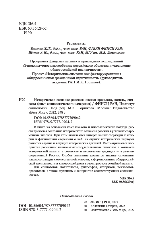 - О книге Института социологии ФНИСЦ РАН «Иcторическое сознание россиян: оценки прошлого, память, символы (опыт социологического измерения)».