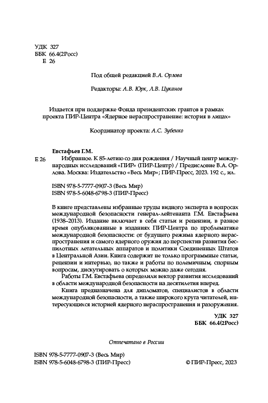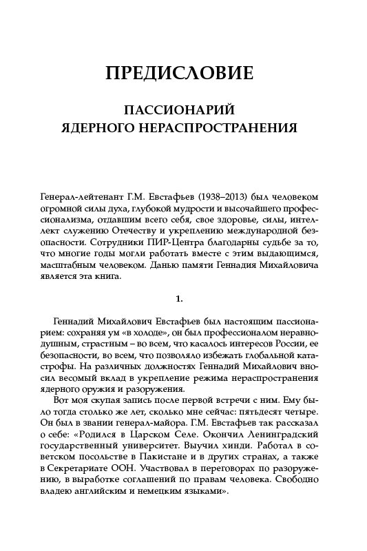 В книге представлены избранные труды видного эксперта в вопросах международной безопасности генерал-лейтенанта Г.М. Евстафьева (1938–2013). Издание включает в себя статьи и рецензии, в разное время опубликованные в изданиях ПИР-Центра по проблематике международной безопасности: от будущего режима ядерного нераспространения и самого ядерного оружия до перспектив развития беспилотных летательных аппаратов и политики Соединенных Штатов в Центральной Азии. Книга содержит не только программные статьи, рецензии и интервью, но также и работы по полемичным, спорным вопросам, дискутировать о которых можно даже сегодня.