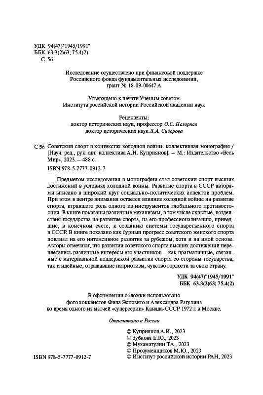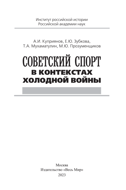 - «Советский спорт в контекстах холодной войны» — так называется книга историков Института российской истории (отв. ред. А. И. Куприянов). Она охватывает эпоху после окончания Второй мировой войны, когда глобальное противостояние двух систем проникло практически во все сферы жизни. Спорт не был исключением.