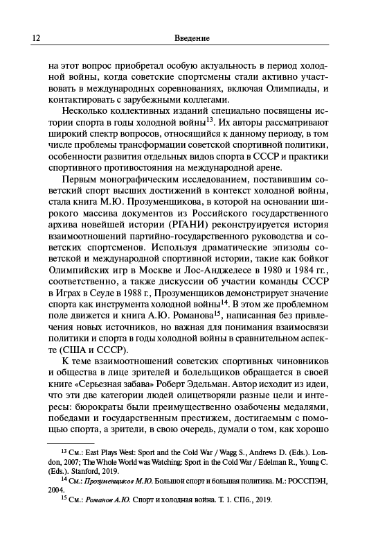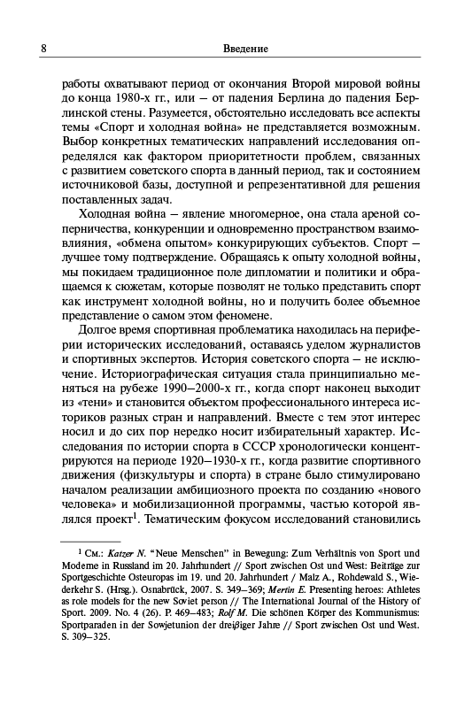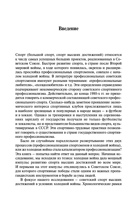Предметом исследования в монографии стал советский спорт высших достижений в условиях холодной войны. Развитие спорта в СССР авторами вписано в широкий круг социально?политических аспектов проблем. При этом в центре внимания остается влияние холодной войны на развитие спорта, игравшего роль одного из инструментов глобального противостояния. В книге показаны различные механизмы, в том числе скрытые, воздействия государства на развитие спорта, на его профессионализацию, приведшие, в конечном счете, к созданию системы государственного спорта в СССР. В книге показано как бурный прогресс советского женского спорта повлиял на его интенсивное развитие за рубежом, хотя и на иной основе. Авторы отмечают, что развитии советского спорта высших достижений переплетались различные интересы его участников – как прагматичные, связанные с материальной поддержкой развития спорта со стороны государства, так и идейные, отражавшие патриотизм, чувство гордости за свою страну.