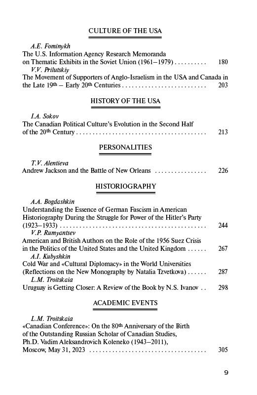 В «Американском ежегоднике 2023» публикуются статьи ведущих российских историков-американистов. Ежегодник открывается статьей о том, что и как изучать в истории США. Исследован широкий круг внутри- и внешнеполитических проблем, среди них «президентская модель» принятия внешнеполитических решений, американо-украинские отношения в годы президентства Б. Клинтона, эволюция банковской системы в Техасе, финансовая политика Трампа, избирательная реформа Демократической партии 2020 г., немецкая диаспора и распространение фашизма в США в 1930-е гг., переговоры СССР и США относительно платежей по ленд-лизу (1946–1948). В рубрике «История Канады» опубликована статья об эволюции канадской политической культуры во второй половине XX в. В рубрике «Персоналии» освещена роль генерала Э. Джексона в сражении за Новый Орлеан (1815). Рубрика «Историография» содержит статьи об осмыслении сущности германского фашизма в историографии США в 1923–1933 гг., освещении Суэцкого кризиса 1956 г. американскими и британскими авторами, даны обзоры новейших книг российских исследователей. В рубрике «Библиография» приведен список публикаций на русском языке по истории США и Канады, вышедших в свет в 2022–2023 гг.