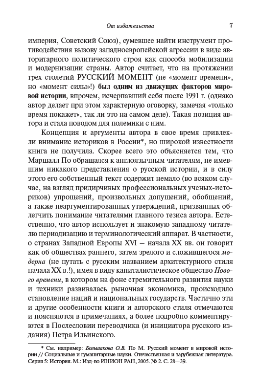 - В 2003 году издательство Принстонского университета выпустило небольшую книгу историка-русиста Маршалла Т.По «Русский момент в мировой истории». Внешне книга представляет собой предельно краткий очерк истории России для англоязычного читателя, однако имеет сверхзадачу — найти ответ на вопрос: каким образом России на протяжении последних пятисот лет (с XVI в.) удавалось выстоять перед агрессией западноевропейских держав, чего не удалось ни одной из внеевропейских империй мира?