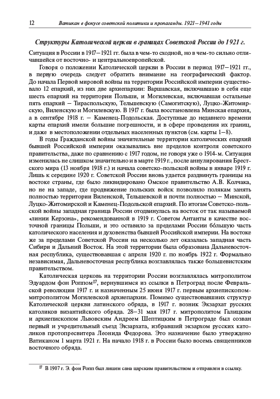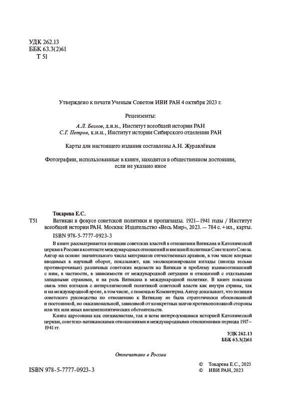 Книга адресована как специалистам, так и всем интересующимся историей Католической церкви, советско-ватиканскими отношениями и международными отношениями периода 1917–1941 гг.