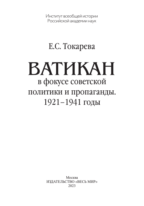 - Евгения Сергеевна Токарева — ведущий научный сотрудник Института всеобщей истории РАН, доктор исторических наук — подготовила фундаментальное исследование «Ватикан в фокусе советской политики и пропаганды. 1921—1941 гг.»