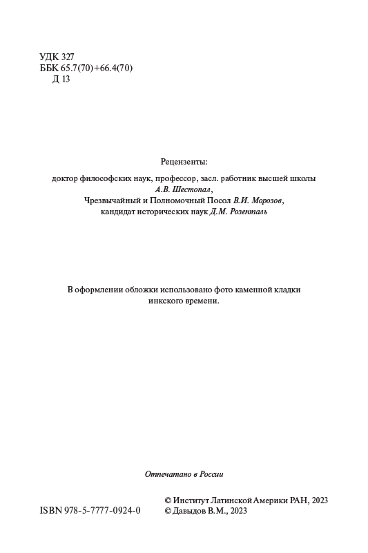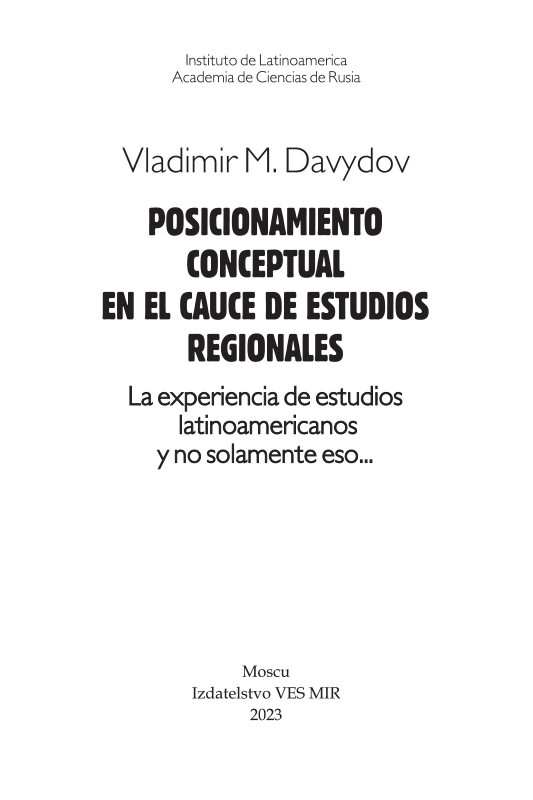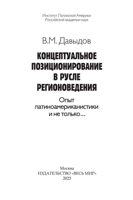 - В заголовок новости вынесено название одной из глав только что вышедшей книги члена-корреспондента РАН, научного руководителя Института Латинской Америки РАН Владимира Михайловича Давыдова, «Концептуальное позиционирование в русле регионоведения. Опыт латиноамериканистики и не только…» И действительно, при всей свободе научного творчества время диктует нам свои законы, акцентирует новые задачи, решение которых предлагает автор.