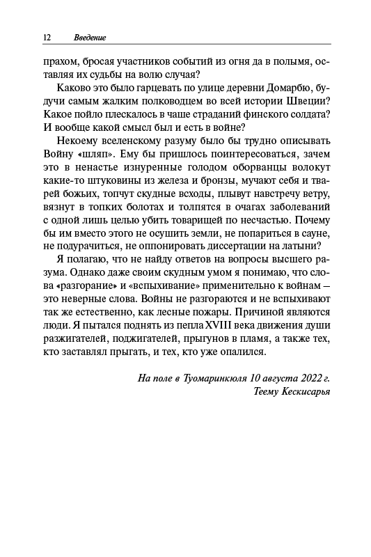 - «Война шляп» — такое название книги, посвящённой неудавшемуся реваншу Швеции за поражение в Великой Северной войне, может показаться странным для русского читателя. Но известный и весьма популярный в Финляндии автор Теему Кескисарья выбрал именно такое название, потому что авантюрные действия правительства шведской «партии шляп» породили и саму войну и привели к позорному поражению.