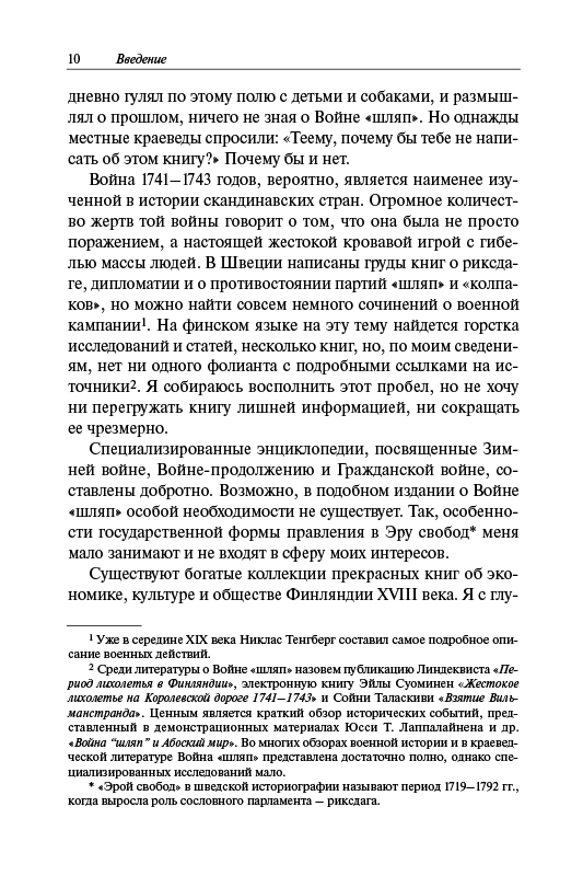 Книга популярного финского историка показывает, что пришедшая к власти в Швеции партия «шляп» развязала ненужную ни финнам, ни шведам войну, стремясь к реваншу за поражение в Северной войне. Автор убедительно доказывает, что война была авантюрой. Впервые в научной литературе, опираясь на архивные источники, он рисует картины повседневных будней войны, с описанием лишений, эпидемий, ненужных потерь, понесенных шведами и простыми финнами. Автор высоко оценивает действия военачальников и солдат русской армии, качество ее оснащения и подготовки. Особо историк отмечает дальновидность императрицы Елизаветы Петровны и ее советников, пошедших на заключение Абоского мира в расчете на долгий мир и на укрепление положения России в Европе. По оценке автора, это была война, в которой победили обе стороны.