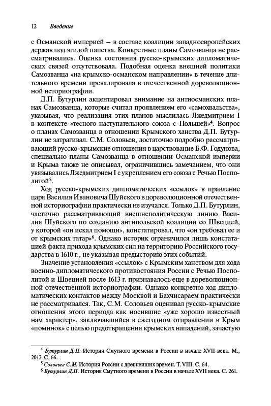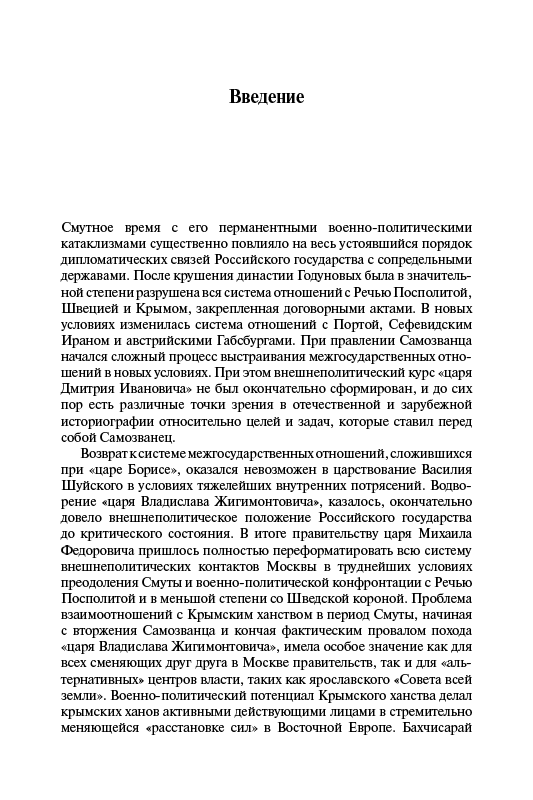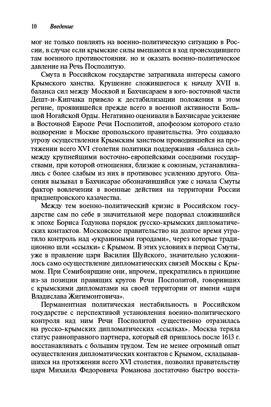 Книга посвящена дипломатическим контактам («ссылкам») Российского государства и Крымского ханства в период Смутного времени. На основании скрупулезного изучения сохранившихся документов – дипломатической переписки, статейных списков, нарративных источников – автор воссоздает сложную картину развития двусторонних отношений государств, вписанную в контекст международной обстановки в Восточной Европе. Автор делает вывод, что на протяжении всего описываемого периода отношения Москвы и Бахчисарая были близки к союзническим и служили интересам обоих государств. В монографии показано значение документов дипломатического характера для изучения внутриполитической обстановки в Крымском ханстве, взаимоотношений Бахчисарая и Стамбула.