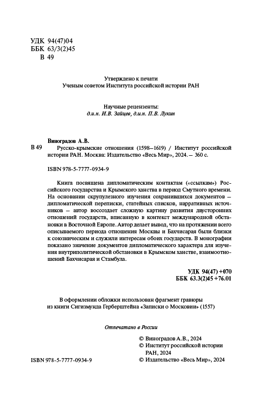- К выходу в свет замечательной книги Александра Вадимовича Виноградова, давно и успешно занимающегося историей отношений двух стран: Русско-крымские отношения (1598–1619).