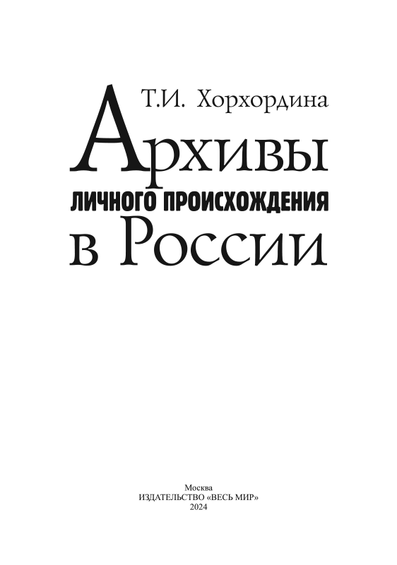 • Фундаментальная книга Татьяны Иннокентьевны Хорхординой «Архивы личного происхождения в России» — повествование и гид по миру архивных документов, порожденных деятельностью и творчеством конкретных людей.