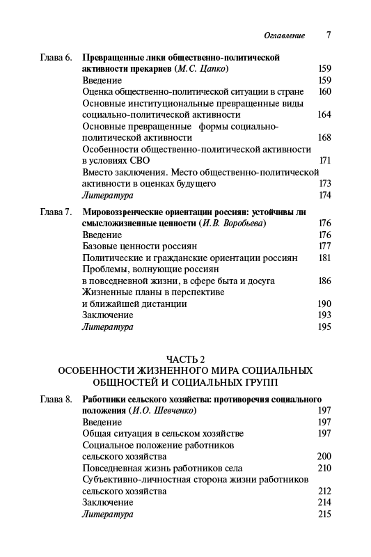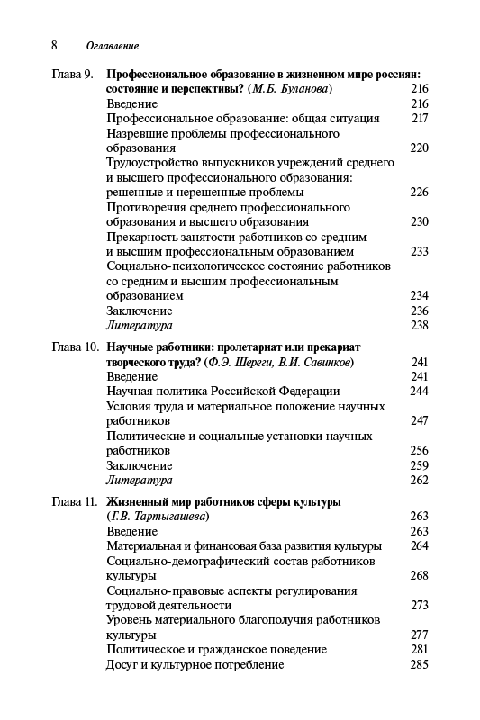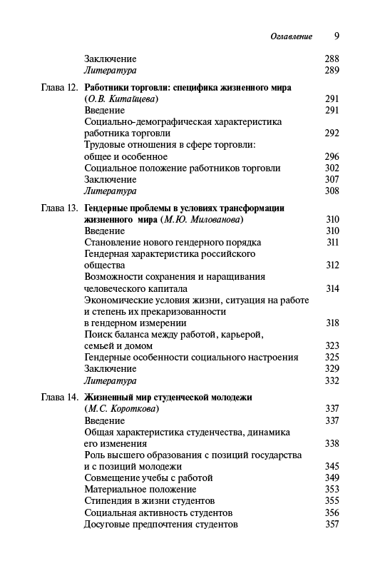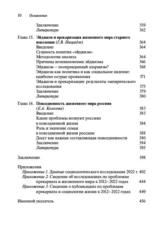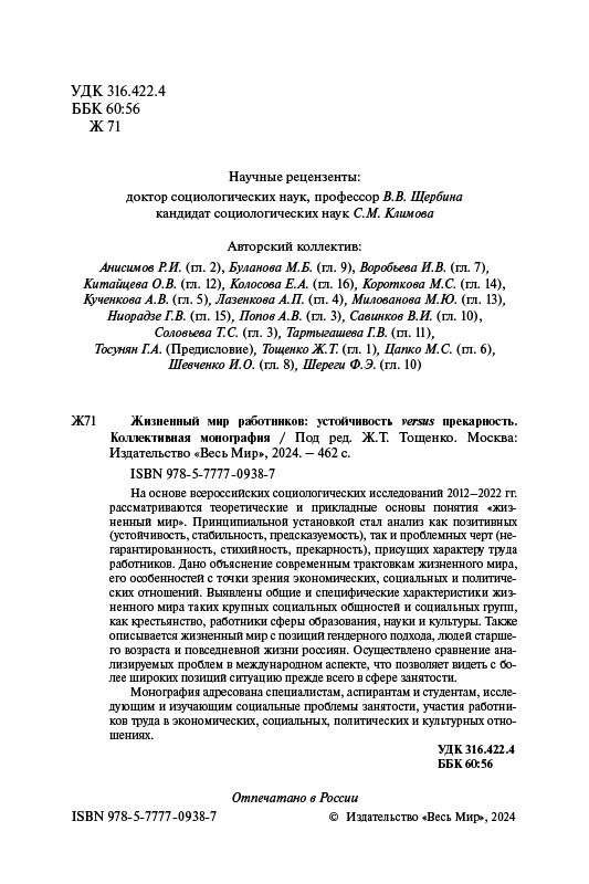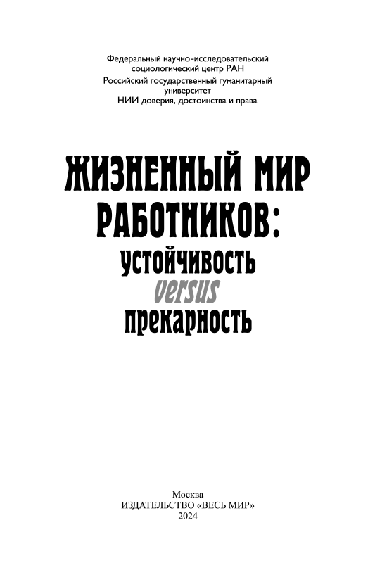 На основе всероссийских социологических исследований 2012–2022 гг. рассматриваются теоретические и прикладные основы понятия «жизненный мир». Принципиальной установкой стал анализ как позитивных (устойчивость, стабильность, предсказуемость), так и проблемных черт (негарантированность, стихийность, прекарность), присущих характеру труда работников. Дано объяснение современным трактовкам жизненного мира, его особенностей с точки зрения экономических, социальных и политических отношений. Выявлены общие и специфические характеристики жизненного мира таких крупных социальных общностей и социальных групп, как крестьянство, работники сферы образования, науки и культуры. Также описывается жизненный мир с позиций гендерного подхода, людей старшего возраста и повседневной жизни россиян. Осуществлено сравнение анализируемых проблем в международном аспекте, что позволяет видеть с более широких позиций ситуацию прежде всего в сфере занятости.