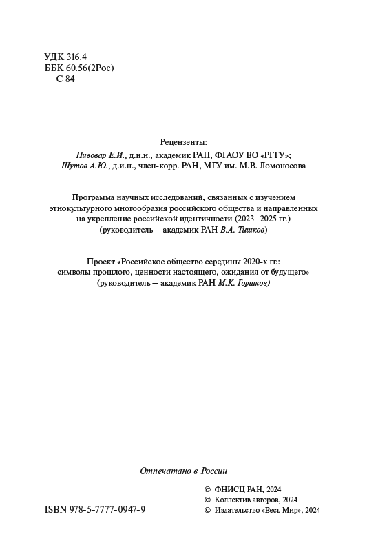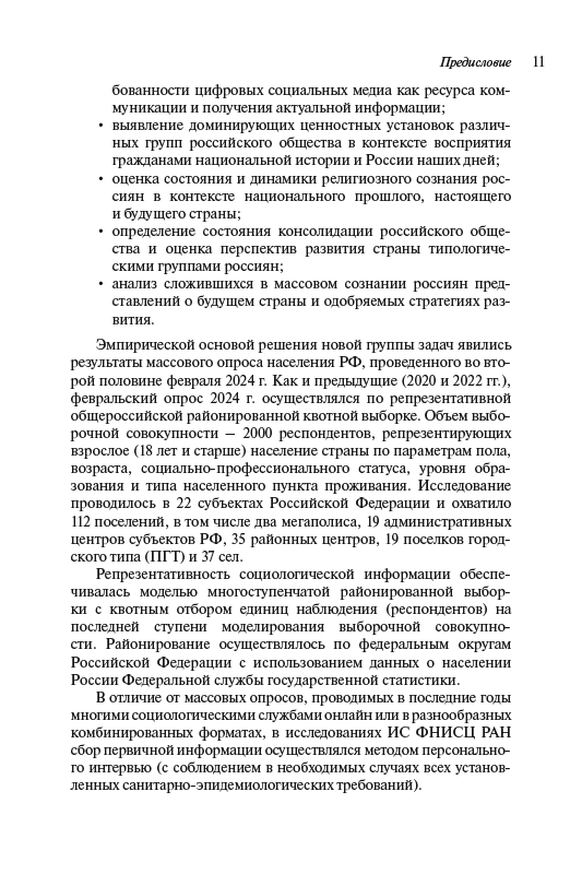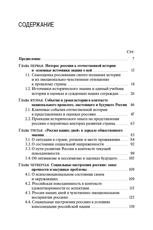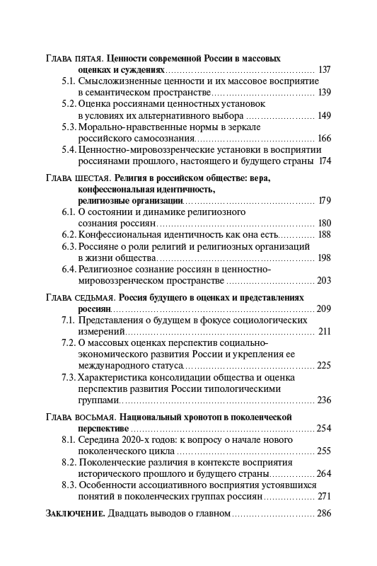 В книге на основе комплексного, многоаспектного и сопоставительного анализа результатов социологического мониторинга рассматриваются состояние и динамика массового сознания россиян, в котором через их оценки и суждения, представления и образы отражаются прошлое, настоящее и будущее страны. При этом выявление интереса наших сограждан к отечественной истории, к источникам получения знаний о ней дополняется диагностикой социально-психологического самочувствия российского общества текущего периода, определением основных смысложизненных ценностей россиян, их религиозно-мировоззренческих ориентаций. Особое внимание уделяется массовым представлениям о России будущего, перспективах ее развития, социальным ожиданиям, а также установлению поколенческих различий в восприятии прошлого, настоящего и будущего страны.