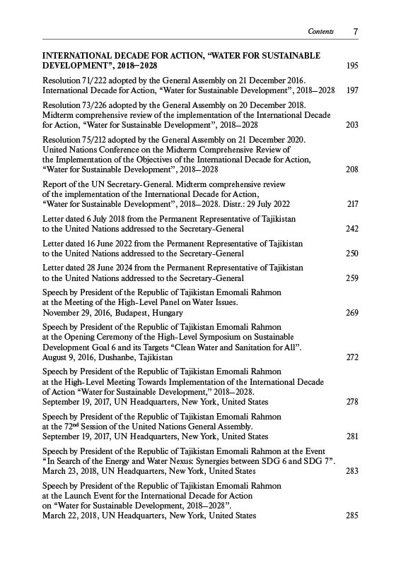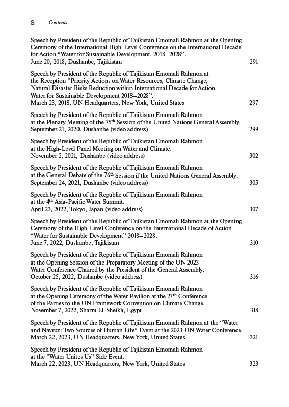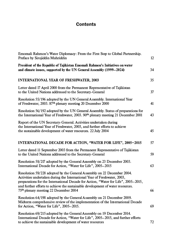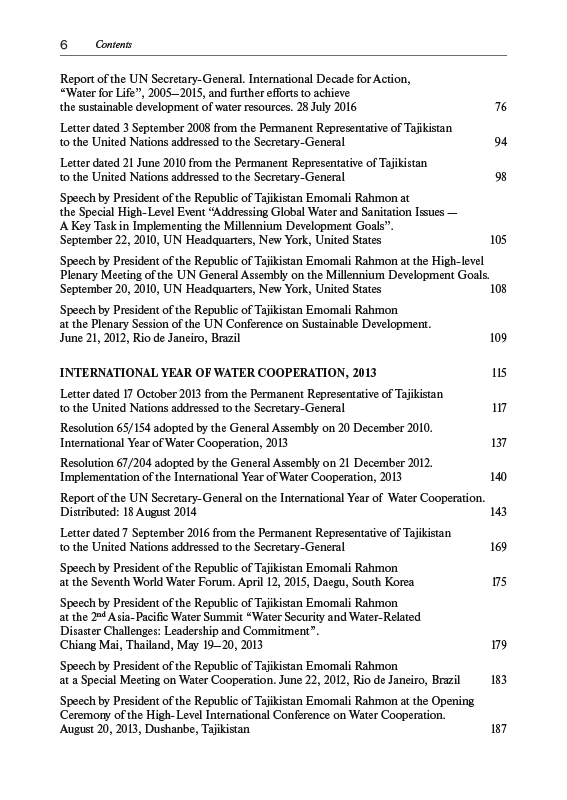 The book includes speeches by the President of the Republic of Tajikistan Emomali Rahmon, resolutions of the UN General Assembly, major declarations and reports of the UN Secretary-General on water initiatives of the Republic of Tajikistan.