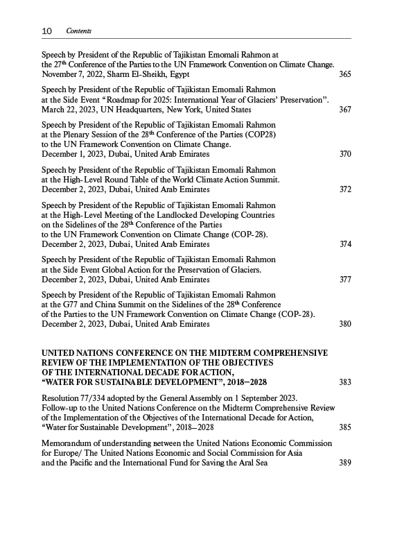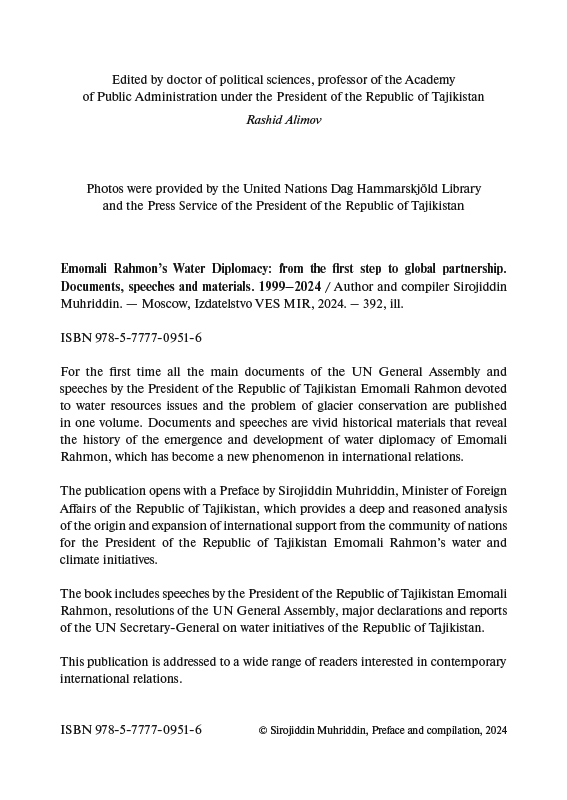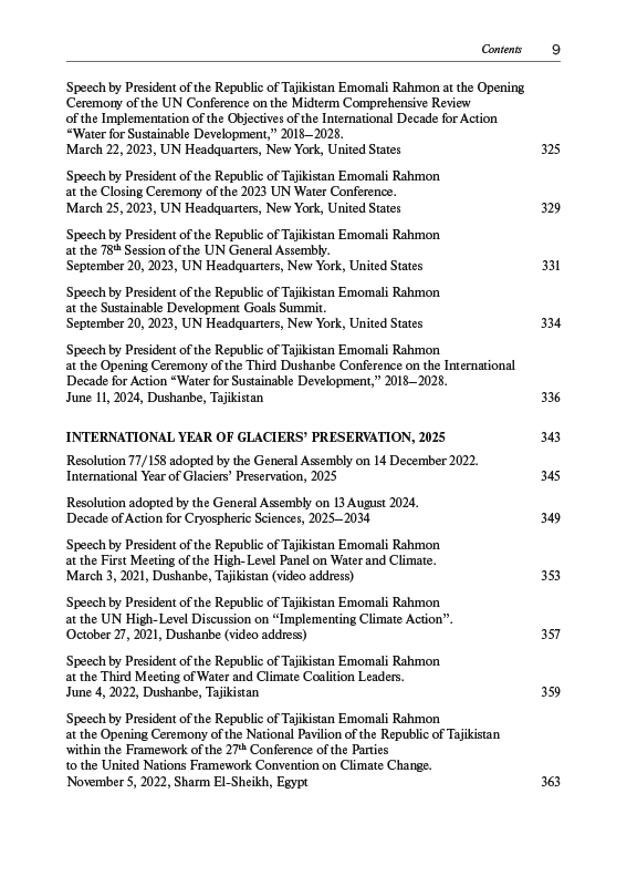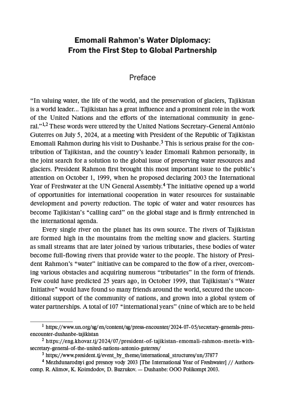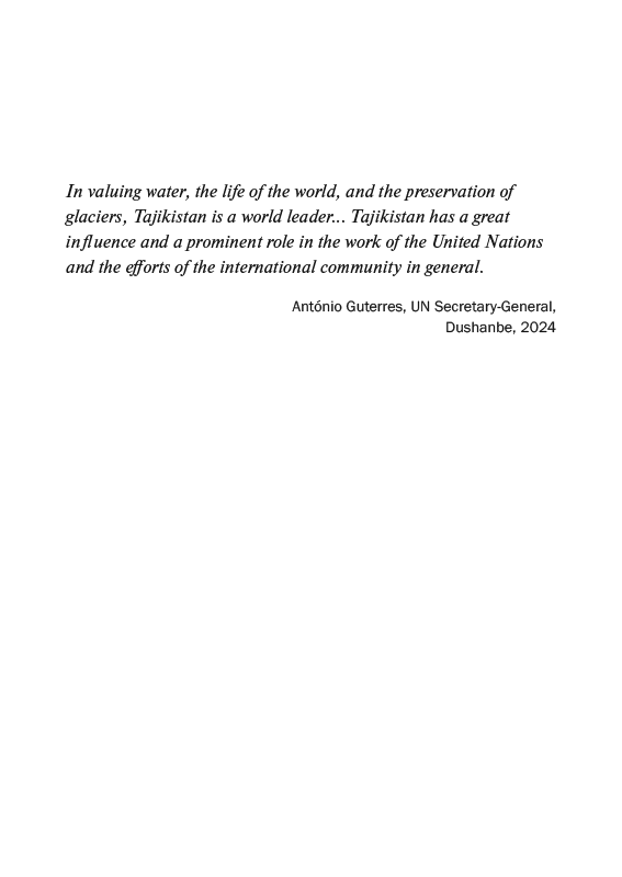 The publication opens with a Preface by Sirojiddin Muhriddin, Minister of Foreign Aff airs of the Republic of Tajikistan, which provides a deep and reasoned analysis of the origin and expansion of international support from the community of nations for the President of the Republic of Tajikistan Emomali Rahmon’s water and climate initiatives.